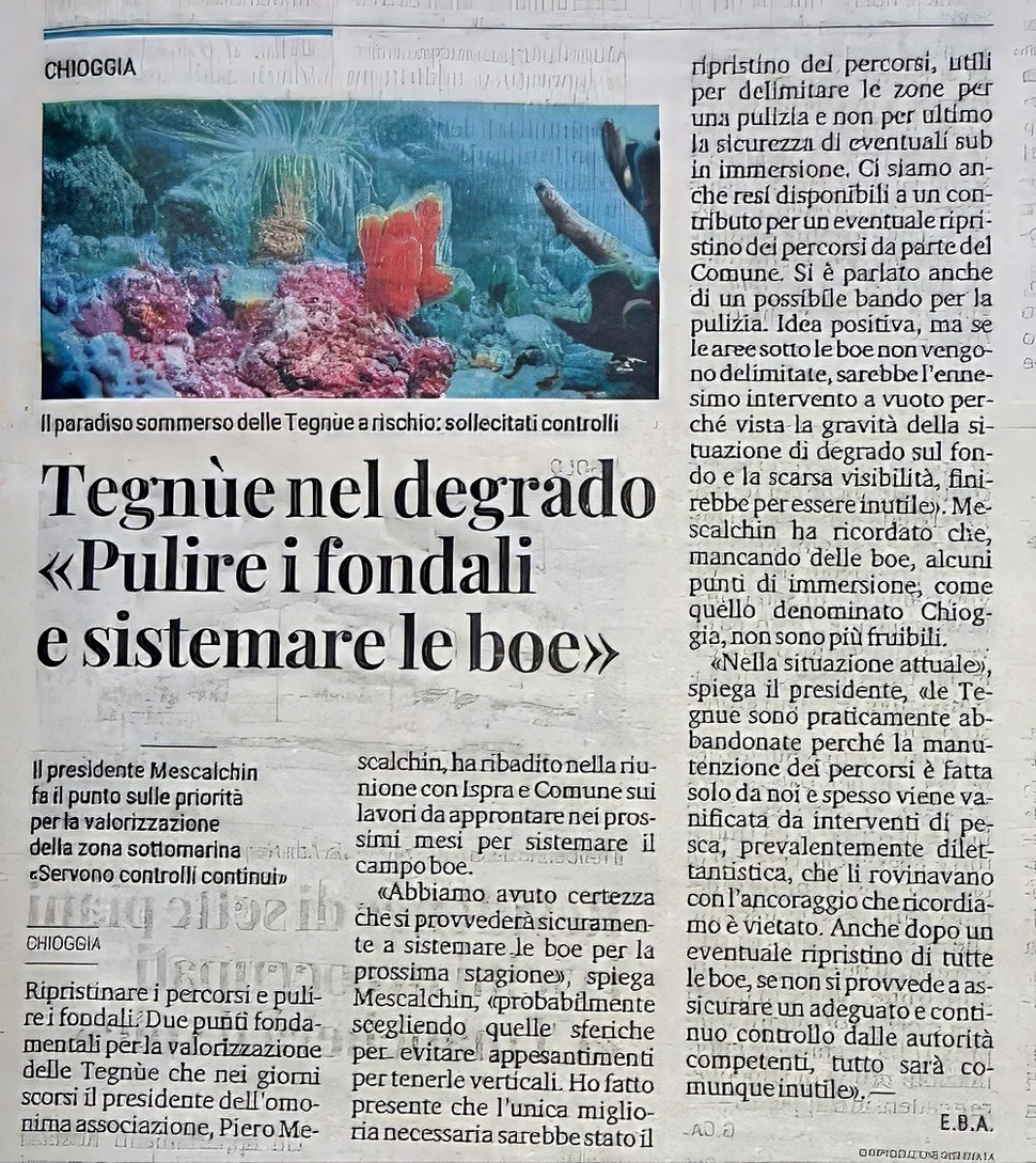 Tegnue nel degrado "Pulire i fondali e sistemare le Boe" Associazione "Tegnue di Chioggia" - onlusPubblicato da Piero Mescalchin in Rassegna stampa · 18 Gennaio 2026