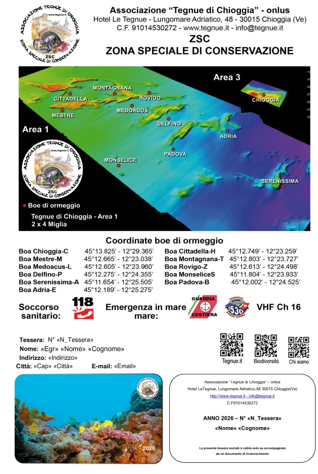 Come già da alcuni anni, anche quest'anno l'Associazione "Le Tegnue di Chioggia" ha abbandonato la tessera fisica (tessera plastificata) per sostituirla con quella digitale che il Socio riceverà dopo essersi iscritto ricevendo tramite e-mail un file PDF con i riferimenti principali della Zona Speciale di Conservazione, le coordinate delle boe di ormeggio, i dati di tesseramento e la tessera "digitale".